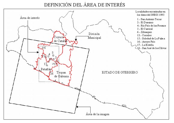 ÁREA DE INTERÉS Debido a que no se definió con exactitud un área de estudio, se delimitó un área de interés de acuerdo con las pláticas sostenidas con personal de la PROFEPA. Los criterios utilizados fueron la división municipal, considerando la frontera entre los municipios de Petatlán, Tecpan de Galeana y Coyuca de Catalán en el estado de Guerrero, así como la ubicación de 10 de 18 localidades de interés para el trabajo (véase figura 1); dichas localidades fueron las encontradas a través de información generada por el INEGI (Instituto Nacional de Estadística Geografía e Informática). El área delimitada cubre aproximadamente 555 500 ha. Localidades