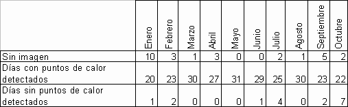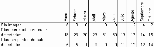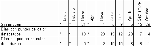 RESULTADOS DEL PROGRAMA PARA EL AÑO 2002 El programa se llevó a cabo durante el periodo del 8 de enero al 31 de octubre, utilizando imágenes de satélite AVHRR nocturnas y diurnas, a partir del mes de abril se trabajaron imágenes de satélite MODIS, utilizando dos pasos. Las imágenes AVHRR nocturnas son captadas entre las 1:00 y las 6:00 hrs. tiempo local. Mientras las imágenes AVHRR diurnas son captadas entre las 16:30 y 19:00 hrs. Las imágenes MODIS se captan entre las 10:50 y las 14:00 hrs.; la diferencia de tiempo entre el paso 1 paso 2 es de aproximadamente de 1 hora con 30 minutos. La hora exacta de la toma de la imagen se muestra en la sección de información tabular. Mapa general El mapa general presenta todos los puntos de calor detectados con imágenes AVHRR nocturnas, durante el periodo del 8 de enero al 31 de octubre de 2002. El mapa es el resultado de la sobreposición de los mapas correspondientes a cada uno de los días en que se registraron puntos de calor. Imágenes analizadas Las siguientes tablas presentan la información referente al número de días sin imagen, al número de días con información de por lo menos un punto de calor y el total de días en los cuales no se detectaron puntos de calor. IMÁGENES AVHRR NOCTURNAS