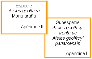 Subespecie (ssp): cada uno de los grupos de individuos en que se dividen las especies, y que poseen caracteres morfológicos semejantes entre sí que los distinguen de las demás subespecies. Cuando una especie es incluida en la CITES, también lo están todas sus subespecies. Sin embargo, una subespecie puede estar protegida de forma independiente.