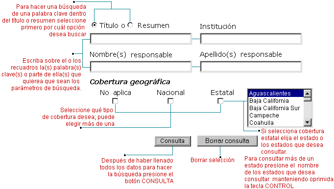 BÚSQUEDA DE PROYECTOS POR PALABRAS CLAVES O COBERTURA GEOGRÁFICA Para generar una búsqueda sobre algún proyecto, usted puede hacerlo por medio de palabras claves en su título o resumen, por el nombre o alguno de los apellidos del responsable, por la institución donde se llevó a cabo, por la cobertura geográfica o por cualquier combinación de los mencionados. Para hacer una búsqueda dentro del título o resumen seleccione una de estas opciones. Para generar una búsqueda por cobertura seleccione si la quiere nacional o de uno o varios estados. Si no hace ninguna selección la búsqueda se hará entre los proyectos apoyados. Si selecciona cobertura estatal seleccione el estado o estados que desee consultar. Nota: Si hace una consulta con una palabra que tenga acento deberá de ponerlo, de lo contrario el resultado no será el mismo. ![]() |