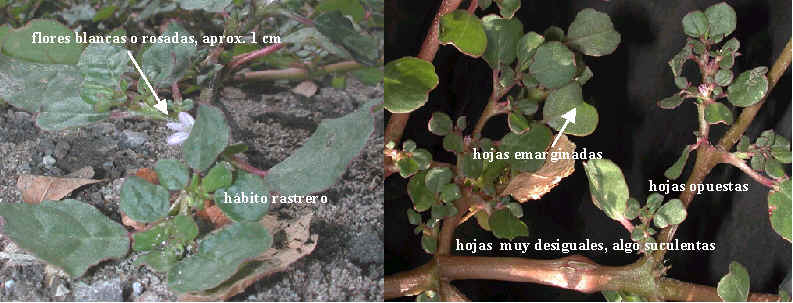 Es una planta generalmente rastrera, algo suculenta, con hojas opuestas, pero desiguales, anchas y emarginadas, con flores blancas a rosadas de aproximadamente 1 cm.