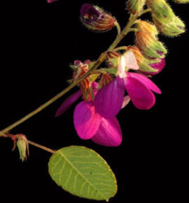 Flores: El cáliz es un tubo acampanado, comprimido lateralmente, con 10 costillas y entre cada una de estas una línea de glándulas elípticas, sus 5 lóbulos angostamente triangulares, planos, verdes, con glándulas en el margen, tan largos como el tubo o un poco más largos, pelillos rígidos y curvados, ubicados sobre las costillas y en el margen de los lóbulos; la corola bicolor (el estandarte blancuzco tornándose rojizo y el resto de los pétalos magenta-púrpura), sin glándulas, formada por 5 pétalos desiguales, el más externo llamado estandarte está plegado y fuertemente curvado hacia atrás, en seguida se ubica un par de pétalos laterales similares entre sí, llamados alas y por último los dos más internos que son los más grandes, también similares entre sí y generalmente fusionados forman la quilla que envuelve a los estambres y al ovario; estambres 10 con los filamentos unidos formando un tubo.