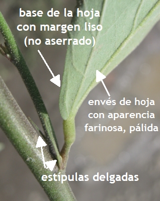 Plántulas: Tienen dos cotiledones acorazonados, y la primera hoja verdadera es rómbica (ver fotografías en el Virginia Tech Weed Identification Guide).