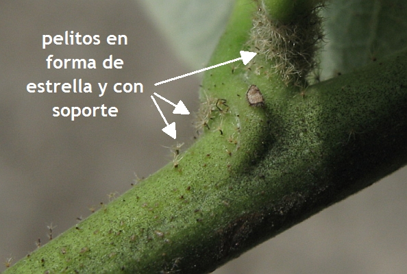 Tallo: Cilíndrico, usualmente sin ramificación abajo de la inflorescencia, con puberulencia (pelos) fina y blanquecina, además con pelos prominentes (estrellados y capitados), especialmente en los pecíolos (sostén de la hoja) cerca de la lámina.