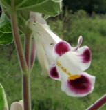 Flores: Cáliz de alrededor de 1.5 cm de largo, formado por 5 sépalos libres, desiguales, verdosos, los 3 superiores oblongos u oblanceolados (con ápice más ancho que la base) a estrechamente elípticos, uno de ellos mucho más largo que los otros, los 2 inferiores más anchos, elípticos, algo oblicuos (con lados asimétricos); corola bilabiada, levemente péndula, de 4 a 5(6) cm de largo, de color variable, desde casi blanco o rosado hasta rojizo-morado, cada uno de los lóbulos provisto por el lado interno de una mancha más o menos circular de color morado oscuro, el interior de la garganta con numerosos puntos morados, así como con una línea de puntos amarillos que la recorre longitudinalmente a partir del centro del lóbulo mayor, tubo de unos 5 mm de largo, oblicuo en la base, expandiéndose en una garganta campanulada algo comprimida y gibosa (inflado en un lado cerca de la base), de unos 3 a 4 cm de largo, limbo (lámina) bilabiado, el lóbulo inferior de alrededor de 1 cm de largo y hasta de 2 cm de ancho, los 4 restantes más chicos; estambres fértiles 2, cerca de la mitad del largo de la corola, anteras de 7 a 8 mm de largo, estaminodios 2 (estambre no funcional), y a veces con presencia de un quinto filamento rudimentario; estigma en forma de dos lamelas (laminillas perpendiculares) algo desiguales.