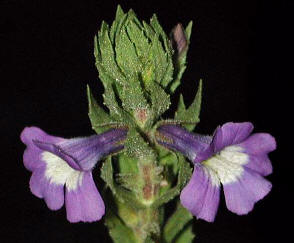 Flores: El cáliz de 5 sépalos más o menos iguales, de hasta 6 mm de largo, cubiertos de pelos glandulares; la corola de color azul-violeta claro, es un tubo largo que hacia el ápice se amplía y se divide en 2 labios, uno de ellos (el superior) dividido en 2 lóbulos y el inferior dividido en 3 lóbulos, con pelillos por fuera y con pelos en la parte interna hacia la base del labio inferior; estambres 4, dos de ellos más largos, las anteras de color púrpura.