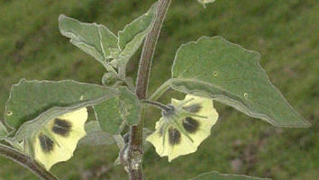 Flores: El cáliz es un tubo acampanado que hacia el ápice se divide en 5 lóbulos angostamente triangulares, con pelillos; la corola es ampliamente acampanada, con un tubo corto y un limbo casi circular con 5 puntas muy poco evidentes, de color amarillo con 5 grandes manchas moradas; estambres 5, las anteras azules con márgenes azul-verdosos.