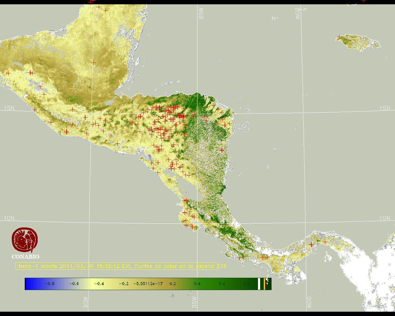 Se considera como punto de calor al elemento espacial mínimo de la imagen (pixel) que reporta una temperatura elevada. Para las imágenes diurnas la temperatura mínima considera es de 42C y para las imágenes nocturnas es de 25C. |