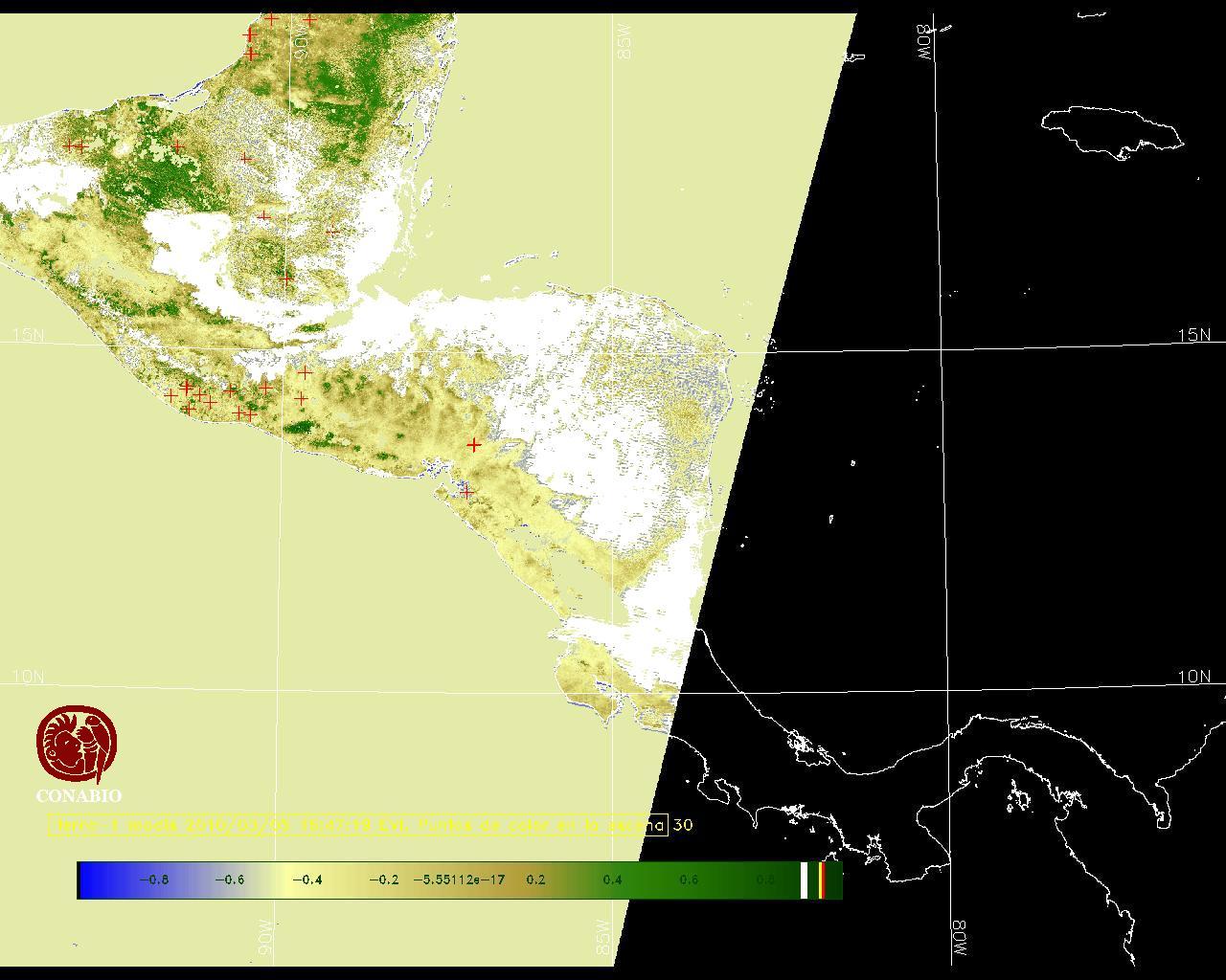Los valores del índice van de -1 a 1, entre más cercano al valor 1 la vegetación presenta mayor vigor. Los índices de vegetación son utilizados para conocer el comportamiento de la vegetación tanto espacial como temporal. |