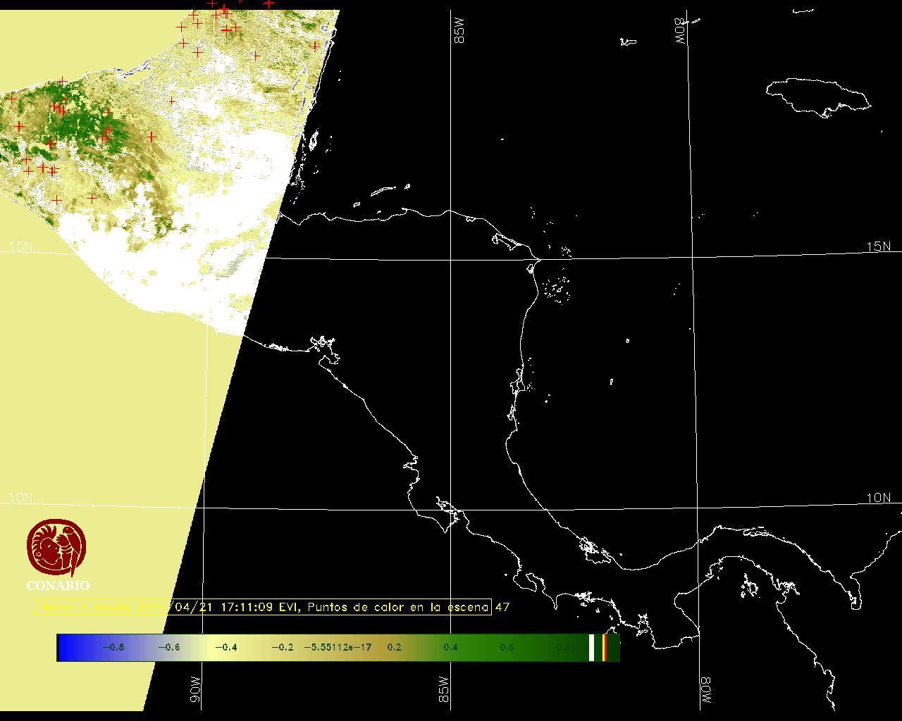 Se considera como punto de calor al elemento espacial mínimo de la imagen (pixel) que reporta una temperatura elevada. Para las imágenes diurnas la temperatura mínima considera es de 42C y para las imágenes nocturnas es de 25C. |