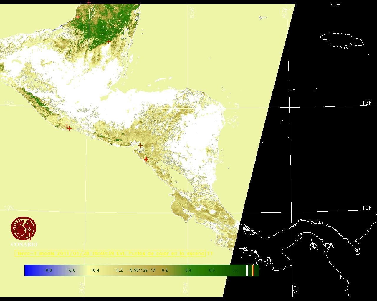 Se considera como punto de calor al elemento espacial mínimo de la imagen (pixel) que reporta una temperatura elevada. Para las imágenes diurnas la temperatura mínima considera es de 42C y para las imágenes nocturnas es de 25C. |