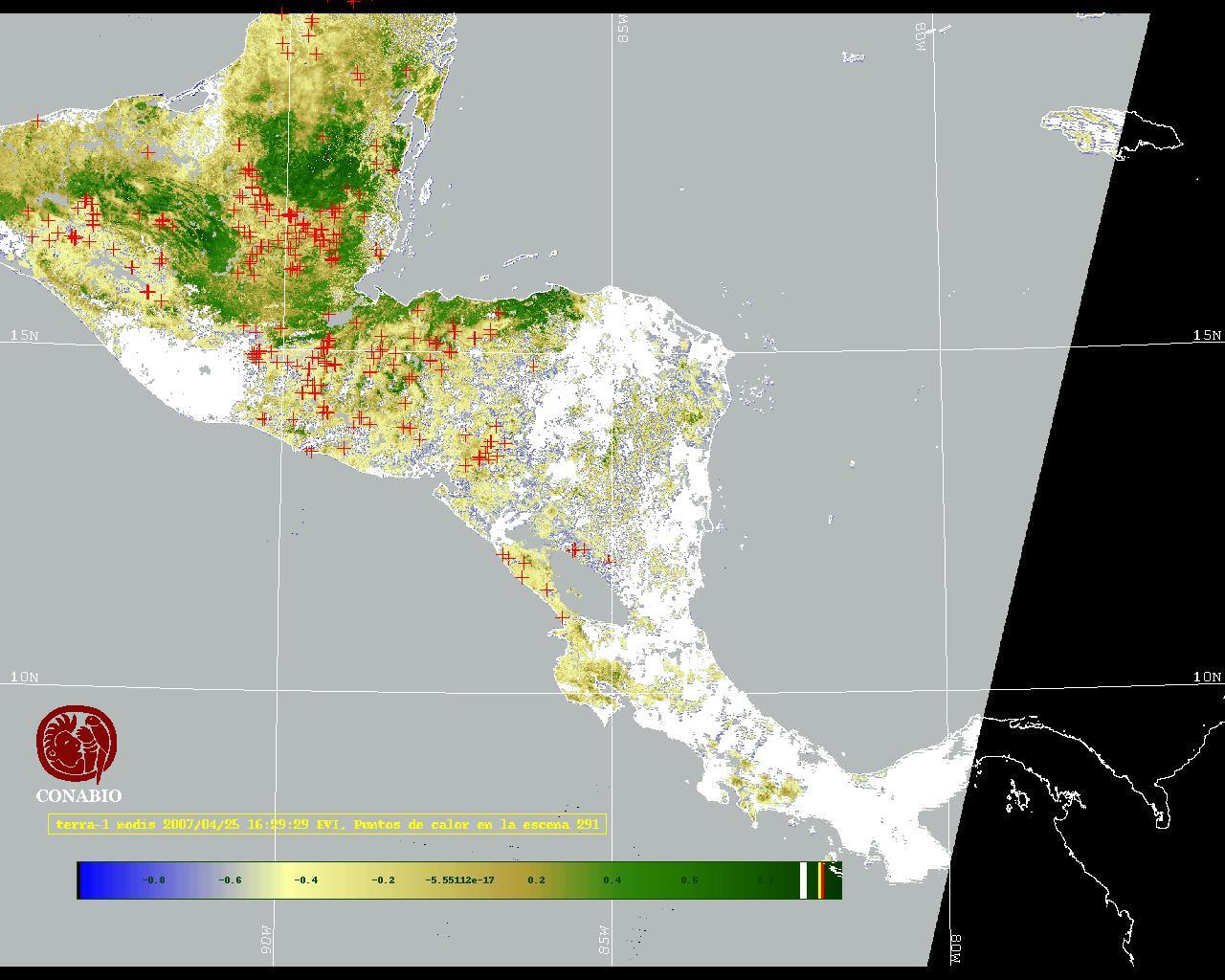 Se considera como punto de calor al elemento espacial mínimo de la imagen (pixel) que reporta una temperatura elevada. Para las imágenes diurnas la temperatura mínima considera es de 42C y para las imágenes nocturnas es de 25C. |