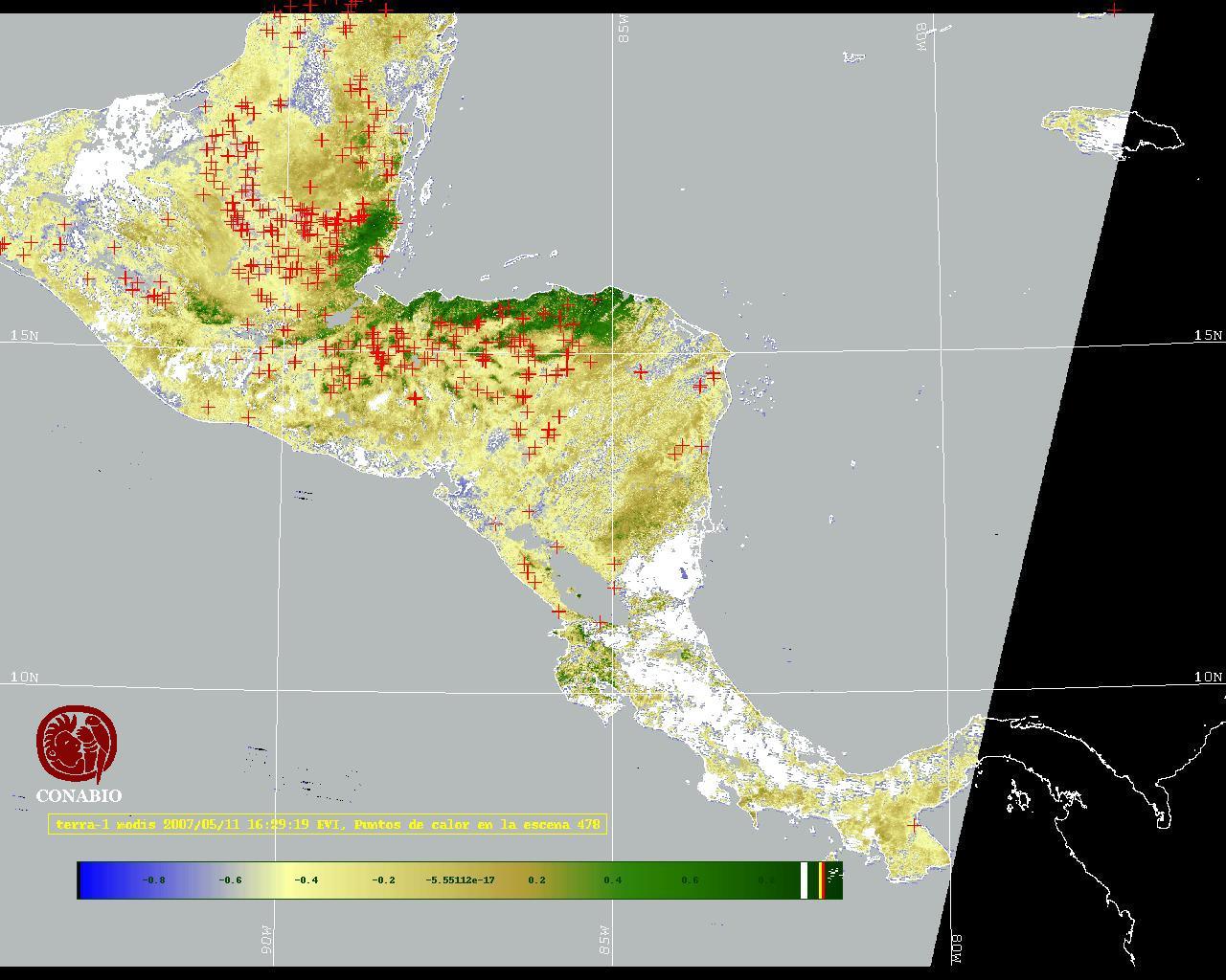 Se considera como punto de calor al elemento espacial mínimo de la imagen (pixel) que reporta una temperatura elevada. Para las imágenes diurnas la temperatura mínima considera es de 42C y para las imágenes nocturnas es de 25C. |