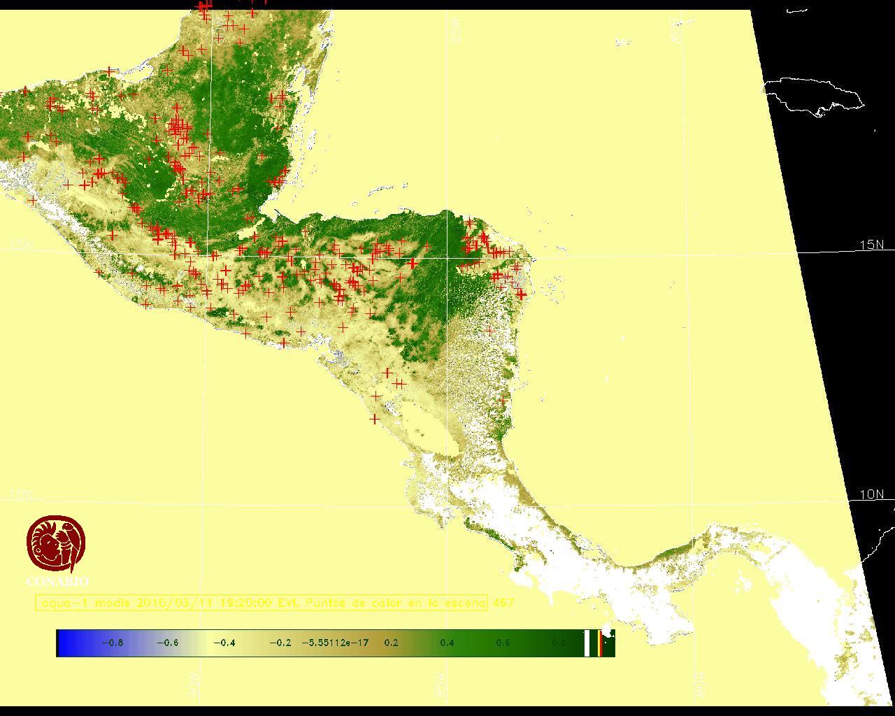 Se considera como punto de calor al elemento espacial mínimo de la imagen (pixel) que reporta una temperatura elevada. Para las imágenes diurnas la temperatura mínima considera es de 42C y para las imágenes nocturnas es de 25C. |