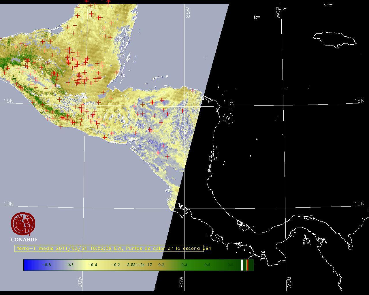 Se considera como punto de calor al elemento espacial mínimo de la imagen (pixel) que reporta una temperatura elevada. Para las imágenes diurnas la temperatura mínima considera es de 42C y para las imágenes nocturnas es de 25C. |