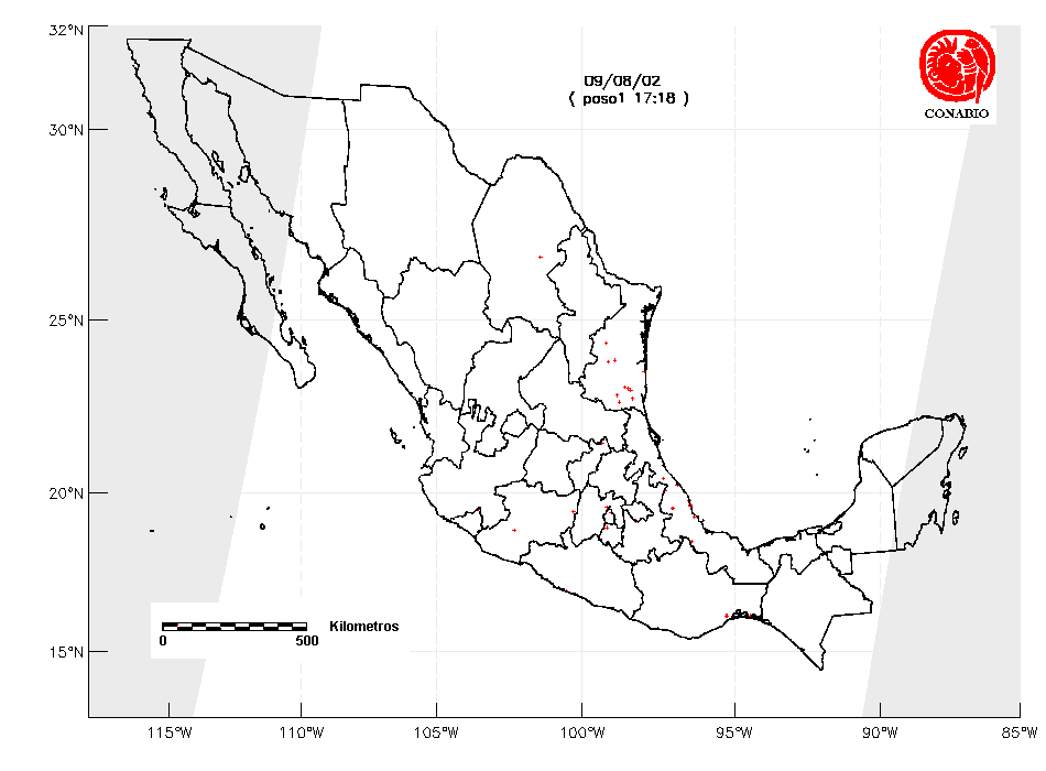Se considera como punto de calor al elemento espacial mínimo de la imagen (pixel) que reporta una temperatura elevada. Para las imágenes diurnas la temperatura mínima considera es de 42°C y para las imágenes nocturnas es de 25°C. |