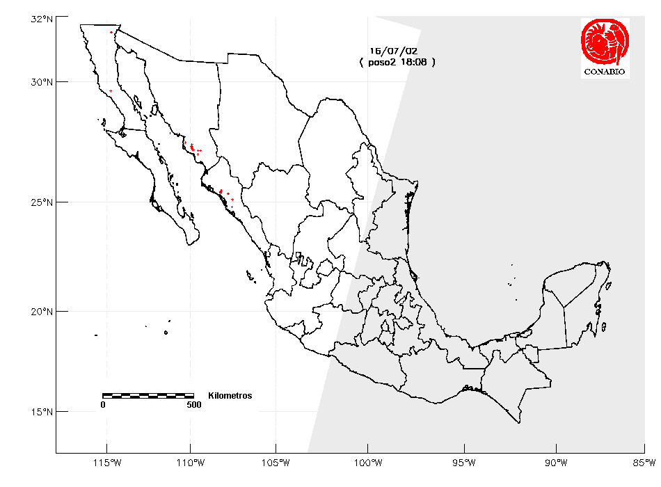 Se considera como punto de calor al elemento espacial mínimo de la imagen (pixel) que reporta una temperatura elevada. Para las imágenes diurnas la temperatura mínima considera es de 42°C y para las imágenes nocturnas es de 25°C. |