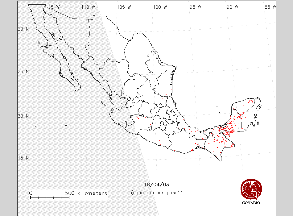 Se considera como punto de calor al elemento espacial mínimo de la imagen (pixel) que reporta una temperatura elevada. Para las imágenes diurnas la temperatura mínima considera es de 42 C y para las imágenes nocturnas es de 25 C. |