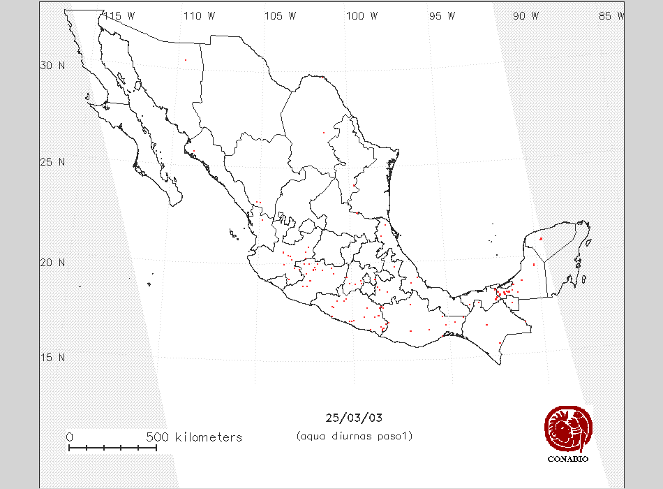 Se considera como punto de calor al elemento espacial mínimo de la imagen (pixel) que reporta una temperatura elevada. Para las imágenes diurnas la temperatura mínima considera es de 42 C y para las imágenes nocturnas es de 25 C. |