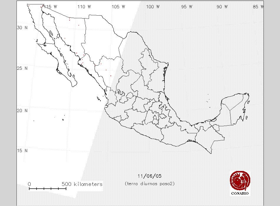 Se considera como punto de calor al elemento espacial mínimo de la imagen (pixel) que reporta una temperatura elevada. Para las imágenes diurnas la temperatura mínima considera es de 42 C y para las imágenes nocturnas es de 25 C. |