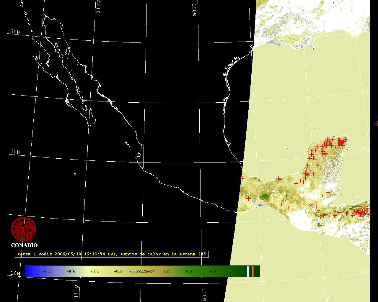 Se considera como punto de calor al elemento espacial mínimo de la imagen (pixel) que reporta una temperatura elevada. Para las imágenes diurnas la temperatura mínima considera es de 42 C y para las imágenes nocturnas es de 25 C. |