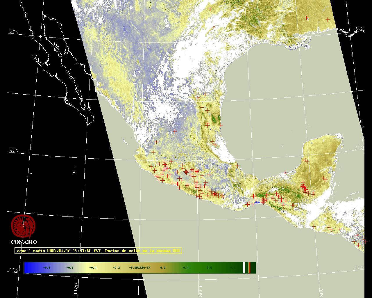 Se considera como punto de calor al elemento espacial mínimo de la imagen (pixel) que reporta una temperatura elevada. Para las imágenes diurnas la temperatura mínima considera es de 42 C y para las imágenes nocturnas es de 25 C. |