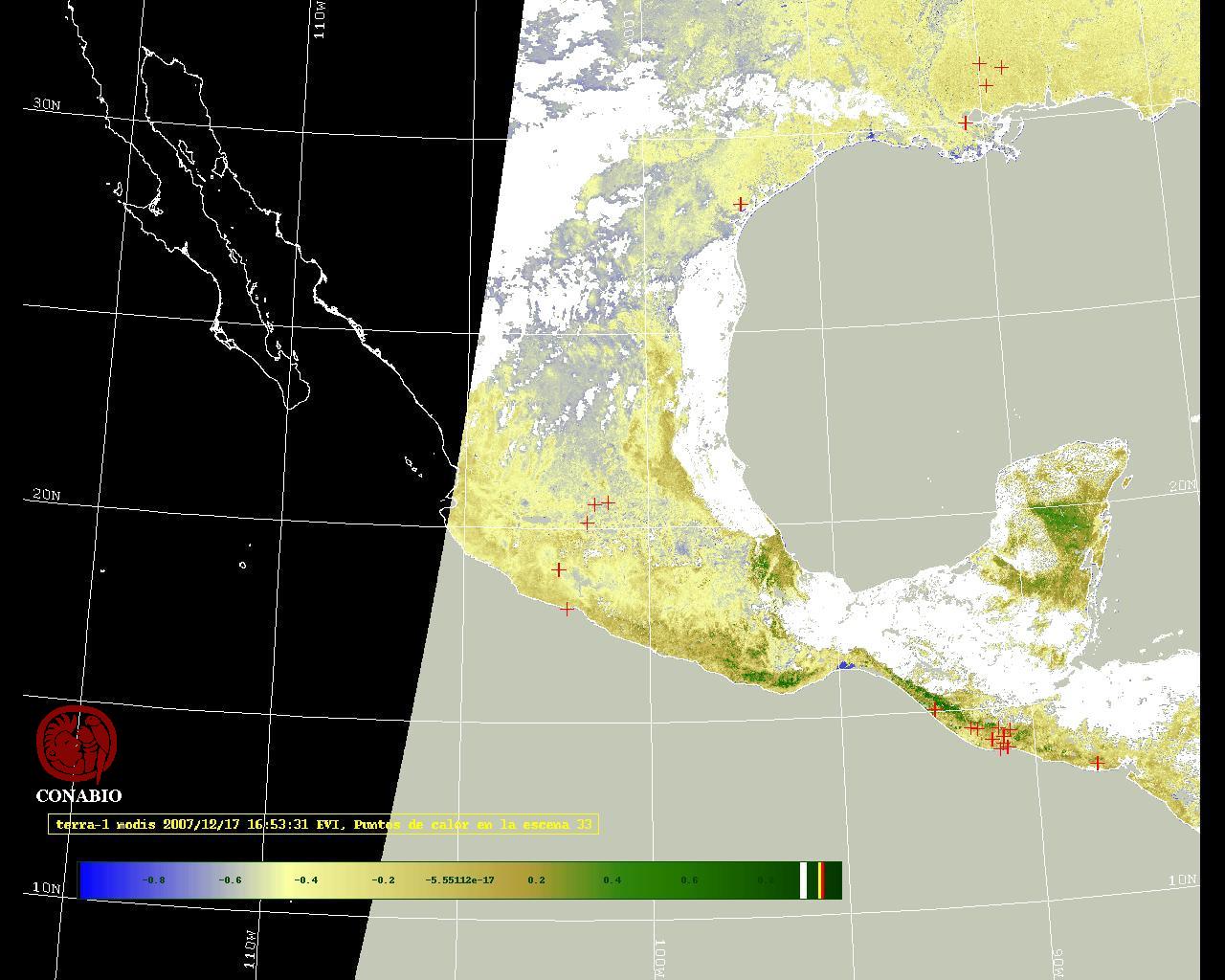 Se considera como punto de calor al elemento espacial mínimo de la imagen (pixel) que reporta una temperatura elevada. Para las imágenes diurnas la temperatura mínima considera es de 42 C y para las imágenes nocturnas es de 25 C. |