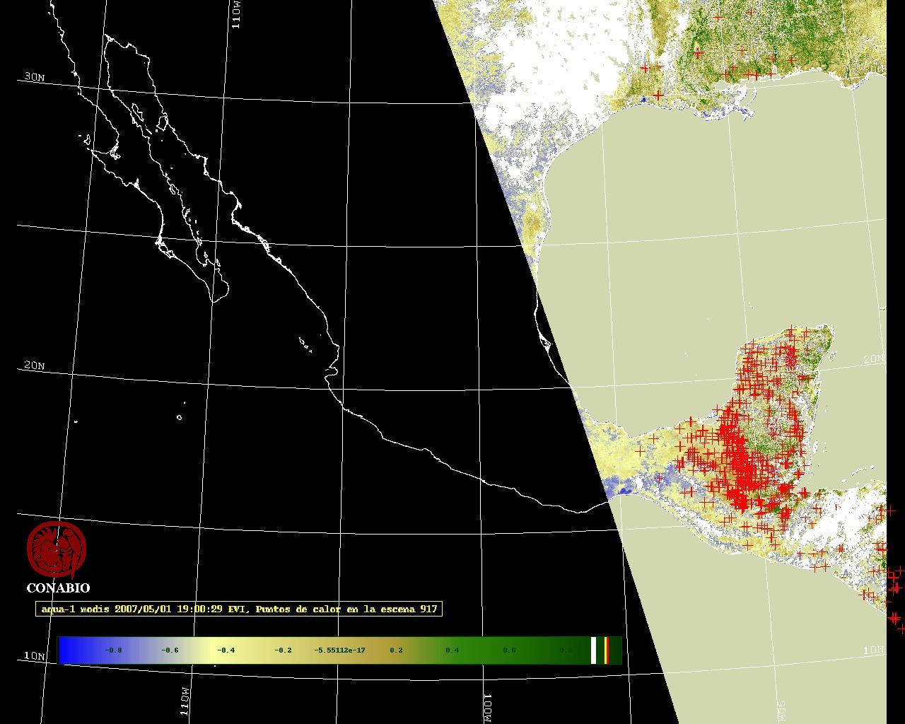 Se considera como punto de calor al elemento espacial mínimo de la imagen (pixel) que reporta una temperatura elevada. Para las imágenes diurnas la temperatura mínima considera es de 42 C y para las imágenes nocturnas es de 25 C. |
