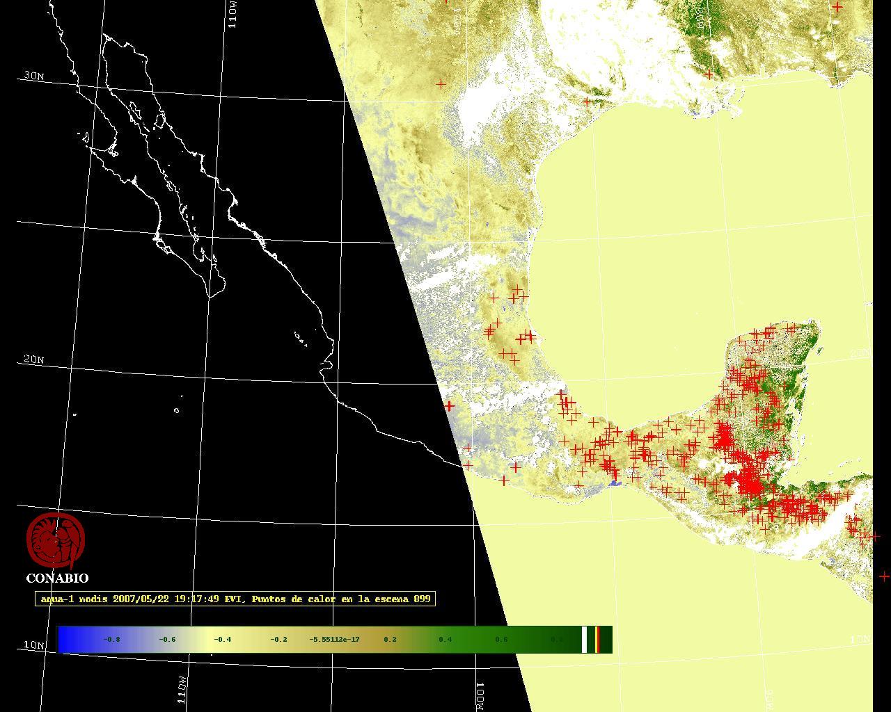 Se considera como punto de calor al elemento espacial mínimo de la imagen (pixel) que reporta una temperatura elevada. Para las imágenes diurnas la temperatura mínima considera es de 42 C y para las imágenes nocturnas es de 25 C. |