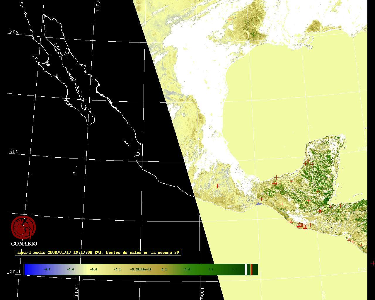 Se considera como punto de calor al elemento espacial mínimo de la imagen (pixel) que reporta una temperatura elevada. Para las imágenes diurnas la temperatura mínima considera es de 42 C y para las imágenes nocturnas es de 25 C. |