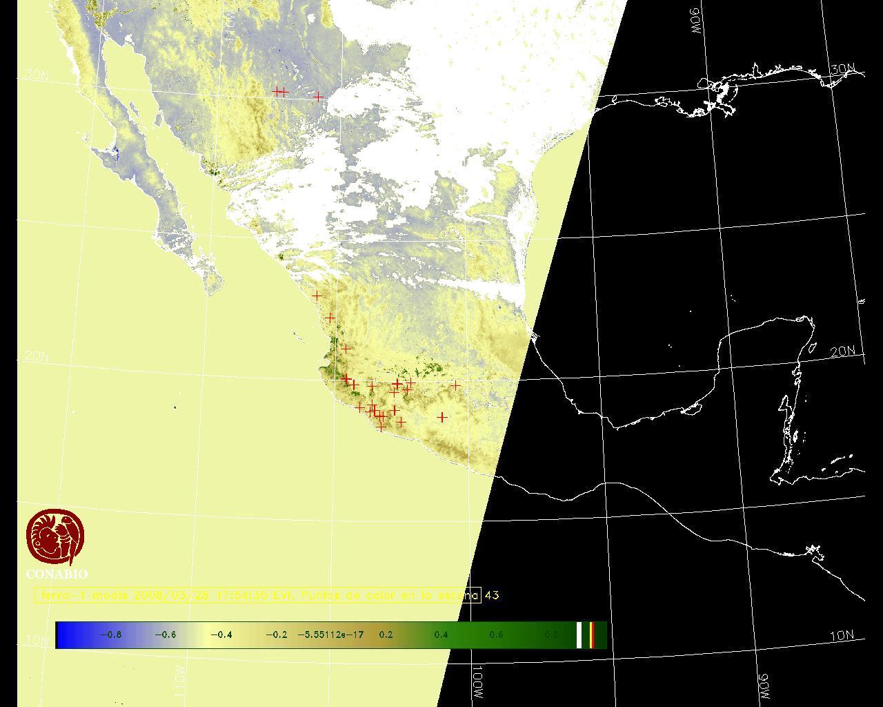 Se considera como punto de calor al elemento espacial mínimo de la imagen (pixel) que reporta una temperatura elevada. Para las imágenes diurnas la temperatura mínima considera es de 42 C y para las imágenes nocturnas es de 25 C. |