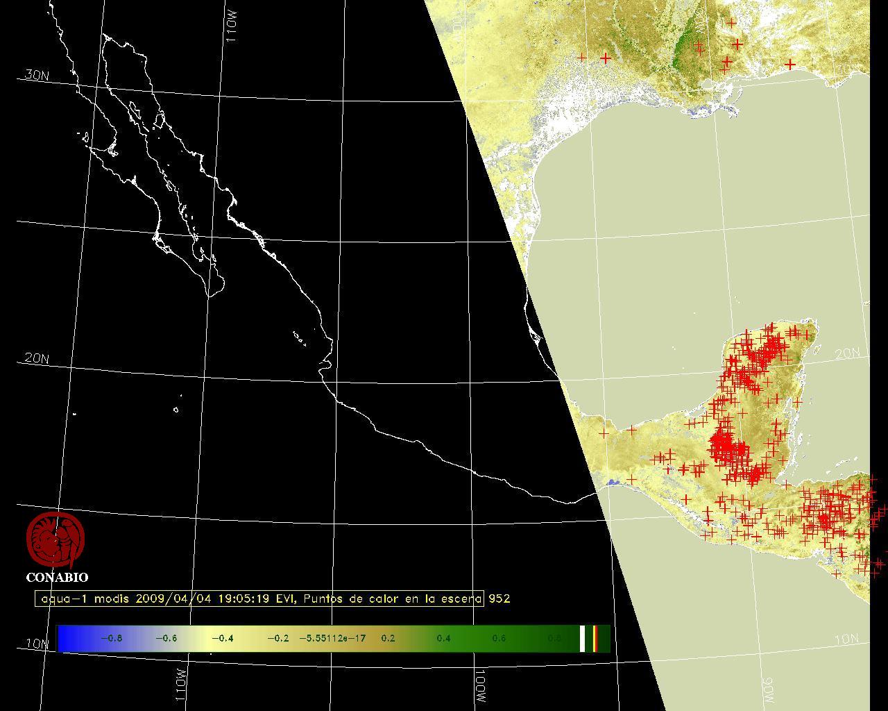 Se considera como punto de calor al elemento espacial mínimo de la imagen (pixel) que reporta una temperatura elevada. Para las imágenes diurnas la temperatura mínima considera es de 42 C y para las imágenes nocturnas es de 25 C. |
