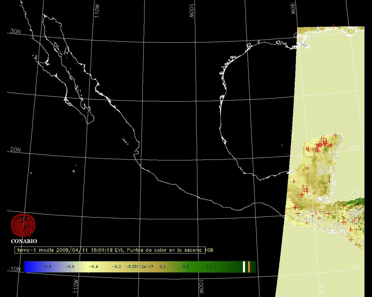 Se considera como punto de calor al elemento espacial mínimo de la imagen (pixel) que reporta una temperatura elevada. Para las imágenes diurnas la temperatura mínima considera es de 42 C y para las imágenes nocturnas es de 25 C. |