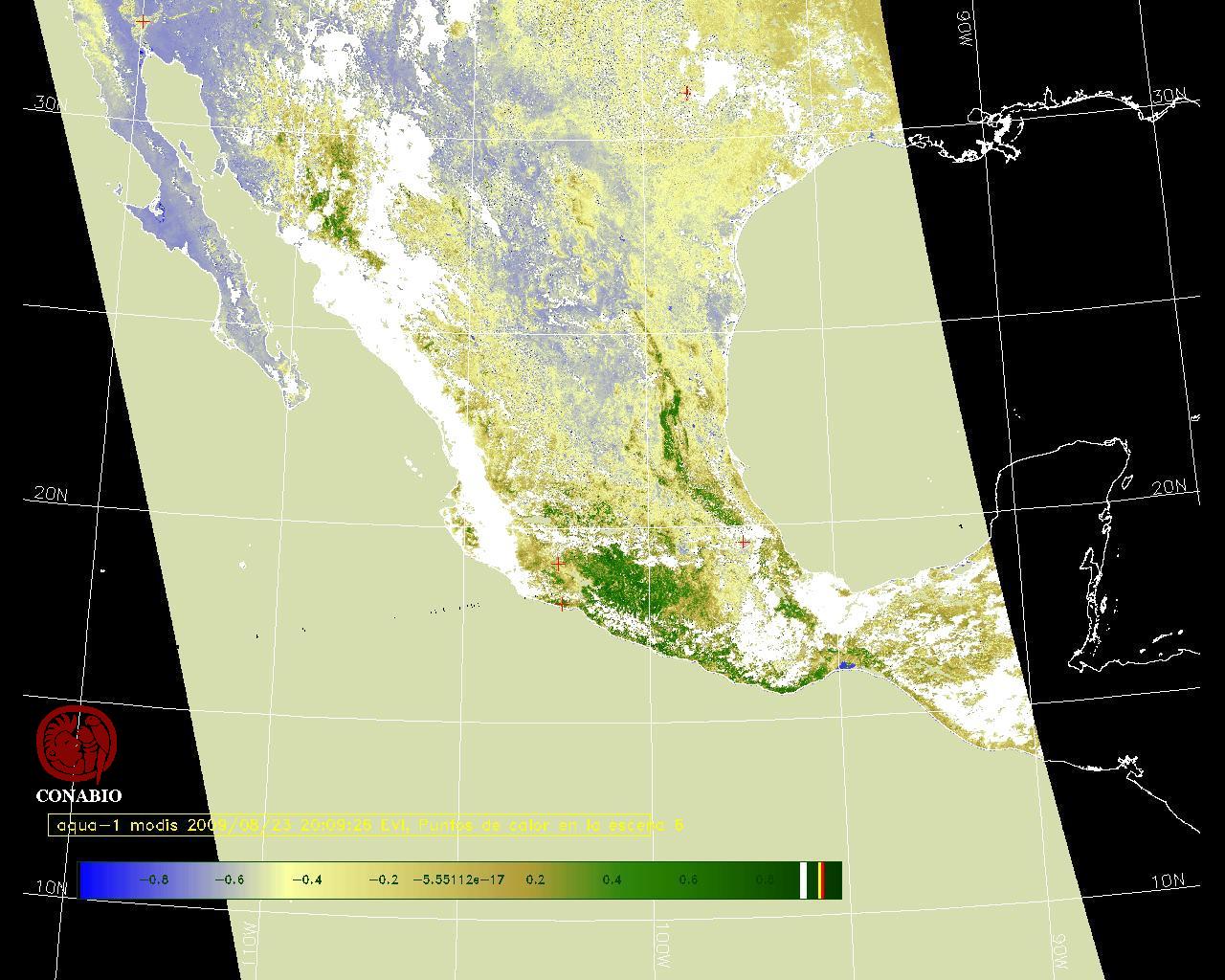 Los valores del índice van de -1 a 1, entre más cercano al valor 1 la vegetación presenta mayor vigor. Los índices de vegetación son utilizados para conocer el comportamiento de la vegetación tanto espacial como temporal. |