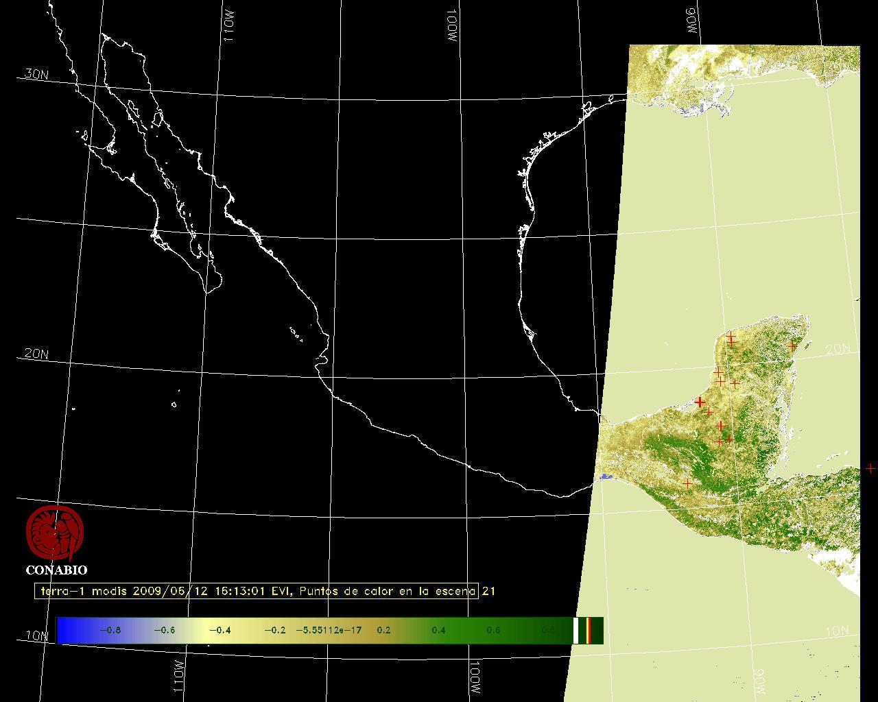 Se considera como punto de calor al elemento espacial mínimo de la imagen (pixel) que reporta una temperatura elevada. Para las imágenes diurnas la temperatura mínima considera es de 42 C y para las imágenes nocturnas es de 25 C. |