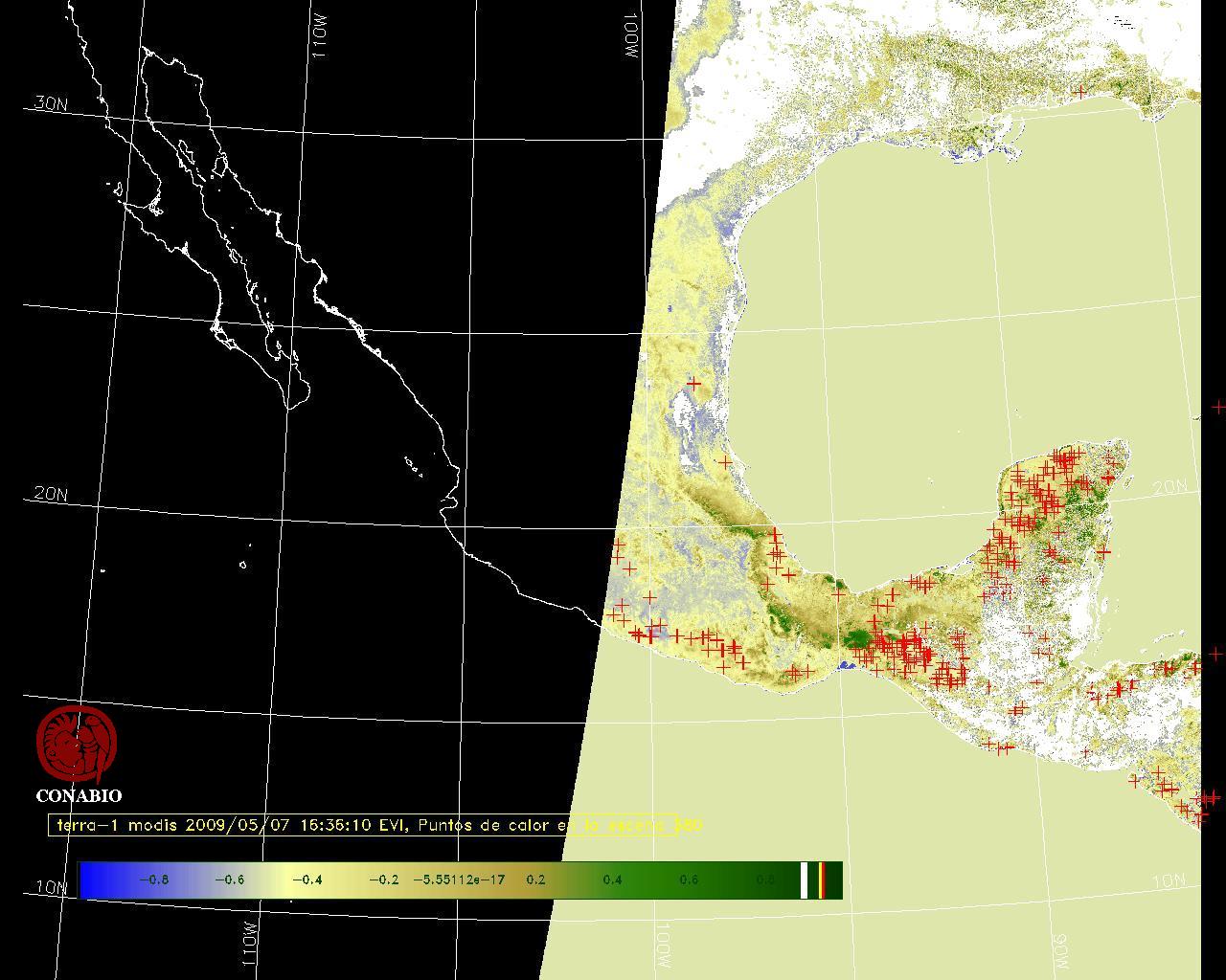 Se considera como punto de calor al elemento espacial mínimo de la imagen (pixel) que reporta una temperatura elevada. Para las imágenes diurnas la temperatura mínima considera es de 42 C y para las imágenes nocturnas es de 25 C. |