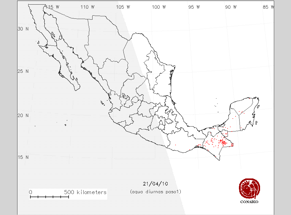 Se considera como punto de calor al elemento espacial mínimo de la imagen (pixel) que reporta una temperatura elevada. Para las imágenes diurnas la temperatura mínima considera es de 42 C y para las imágenes nocturnas es de 25 C. |