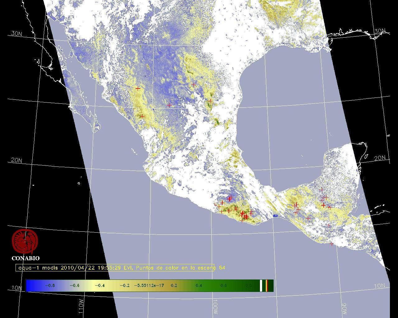 Se considera como punto de calor al elemento espacial mínimo de la imagen (pixel) que reporta una temperatura elevada. Para las imágenes diurnas la temperatura mínima considera es de 42 C y para las imágenes nocturnas es de 25 C. |