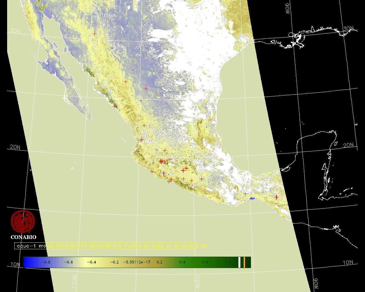 Se considera como punto de calor al elemento espacial mínimo de la imagen (pixel) que reporta una temperatura elevada. Para las imágenes diurnas la temperatura mínima considera es de 42 C y para las imágenes nocturnas es de 25 C. |