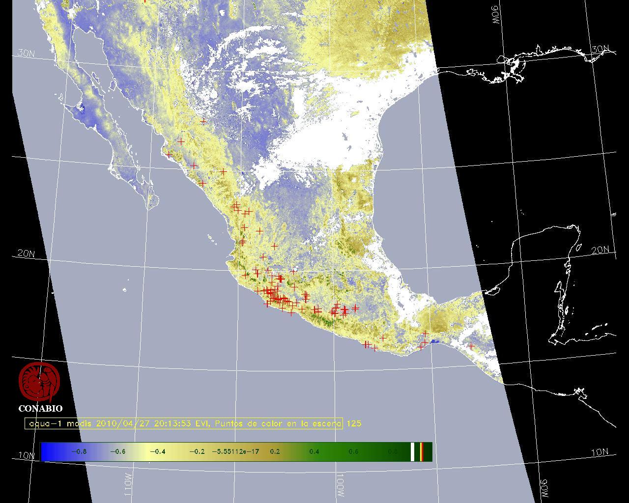 Se considera como punto de calor al elemento espacial mínimo de la imagen (pixel) que reporta una temperatura elevada. Para las imágenes diurnas la temperatura mínima considera es de 42 C y para las imágenes nocturnas es de 25 C. |