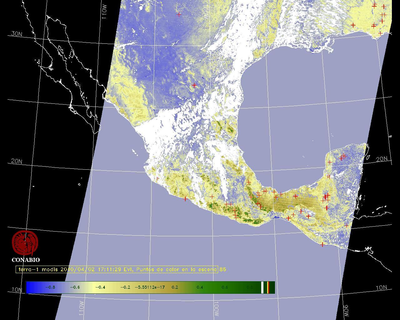 Se considera como punto de calor al elemento espacial mínimo de la imagen (pixel) que reporta una temperatura elevada. Para las imágenes diurnas la temperatura mínima considera es de 42 C y para las imágenes nocturnas es de 25 C. |