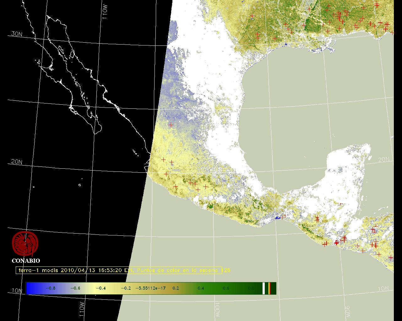 Se considera como punto de calor al elemento espacial mínimo de la imagen (pixel) que reporta una temperatura elevada. Para las imágenes diurnas la temperatura mínima considera es de 42 C y para las imágenes nocturnas es de 25 C. |