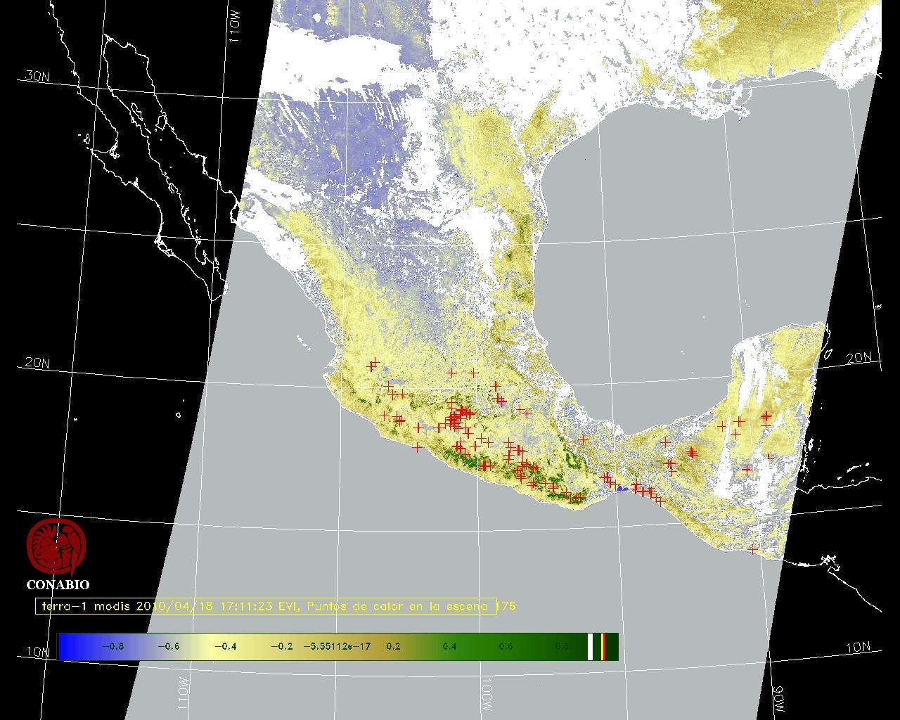 Se considera como punto de calor al elemento espacial mínimo de la imagen (pixel) que reporta una temperatura elevada. Para las imágenes diurnas la temperatura mínima considera es de 42 C y para las imágenes nocturnas es de 25 C. |