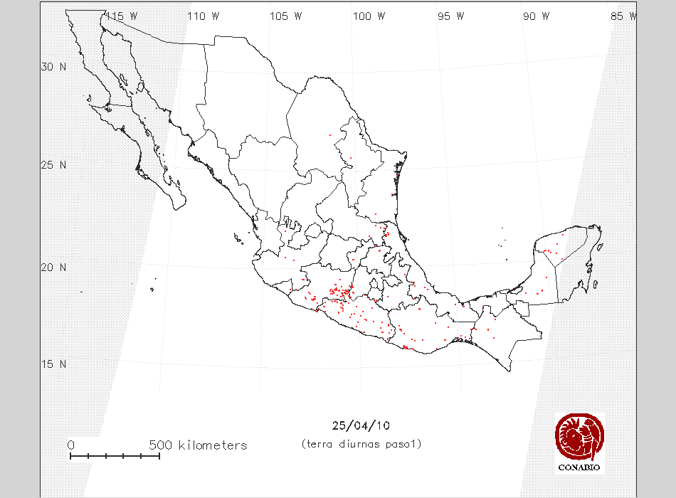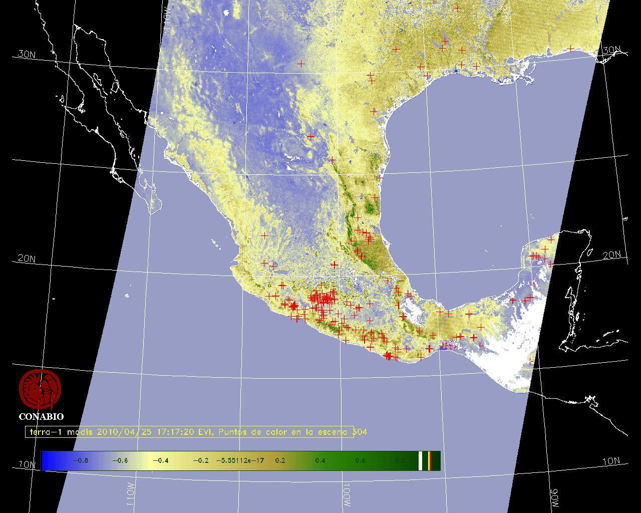 Se considera como punto de calor al elemento espacial mínimo de la imagen (pixel) que reporta una temperatura elevada. Para las imágenes diurnas la temperatura mínima considera es de 42 C y para las imágenes nocturnas es de 25 C. |