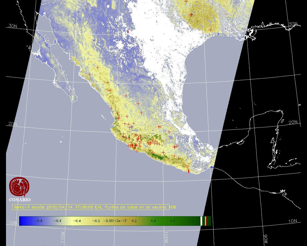 Se considera como punto de calor al elemento espacial mínimo de la imagen (pixel) que reporta una temperatura elevada. Para las imágenes diurnas la temperatura mínima considera es de 42 C y para las imágenes nocturnas es de 25 C. |