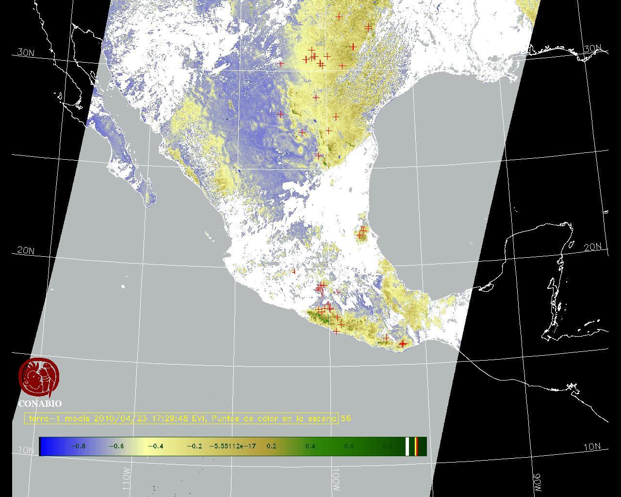 Se considera como punto de calor al elemento espacial mínimo de la imagen (pixel) que reporta una temperatura elevada. Para las imágenes diurnas la temperatura mínima considera es de 42 C y para las imágenes nocturnas es de 25 C. |