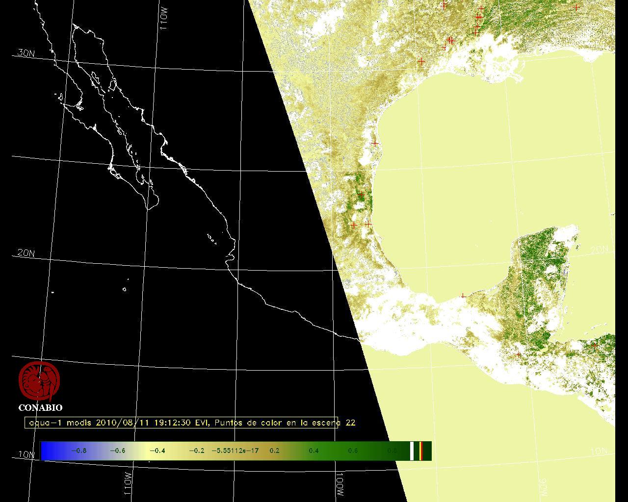 Se considera como punto de calor al elemento espacial mínimo de la imagen (pixel) que reporta una temperatura elevada. Para las imágenes diurnas la temperatura mínima considera es de 42 C y para las imágenes nocturnas es de 25 C. |