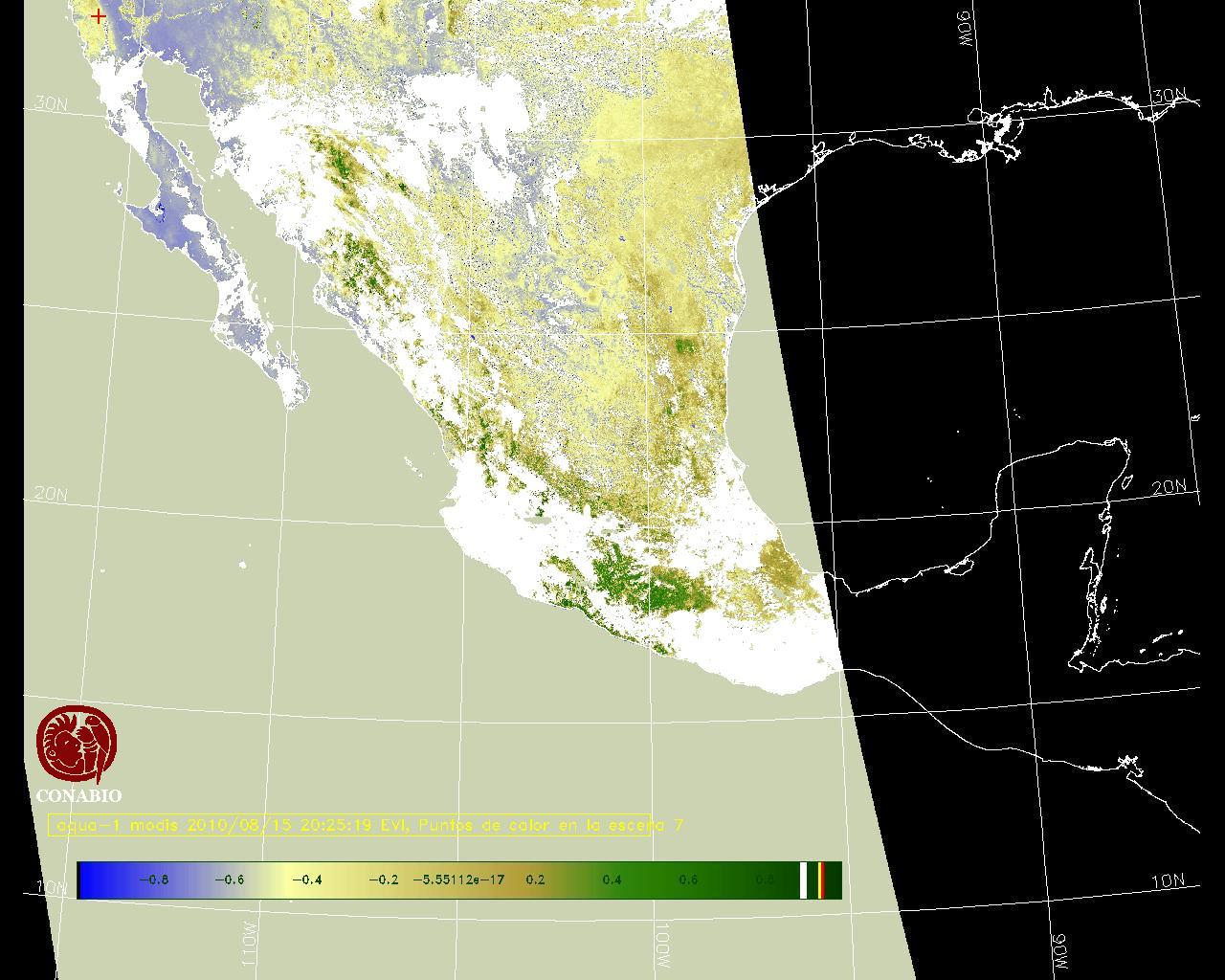Se considera como punto de calor al elemento espacial mínimo de la imagen (pixel) que reporta una temperatura elevada. Para las imágenes diurnas la temperatura mínima considera es de 42 C y para las imágenes nocturnas es de 25 C. |