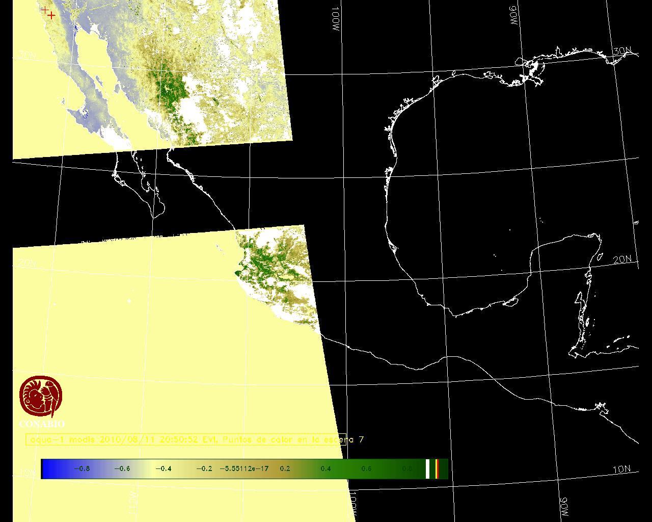 Se considera como punto de calor al elemento espacial mínimo de la imagen (pixel) que reporta una temperatura elevada. Para las imágenes diurnas la temperatura mínima considera es de 42 C y para las imágenes nocturnas es de 25 C. |