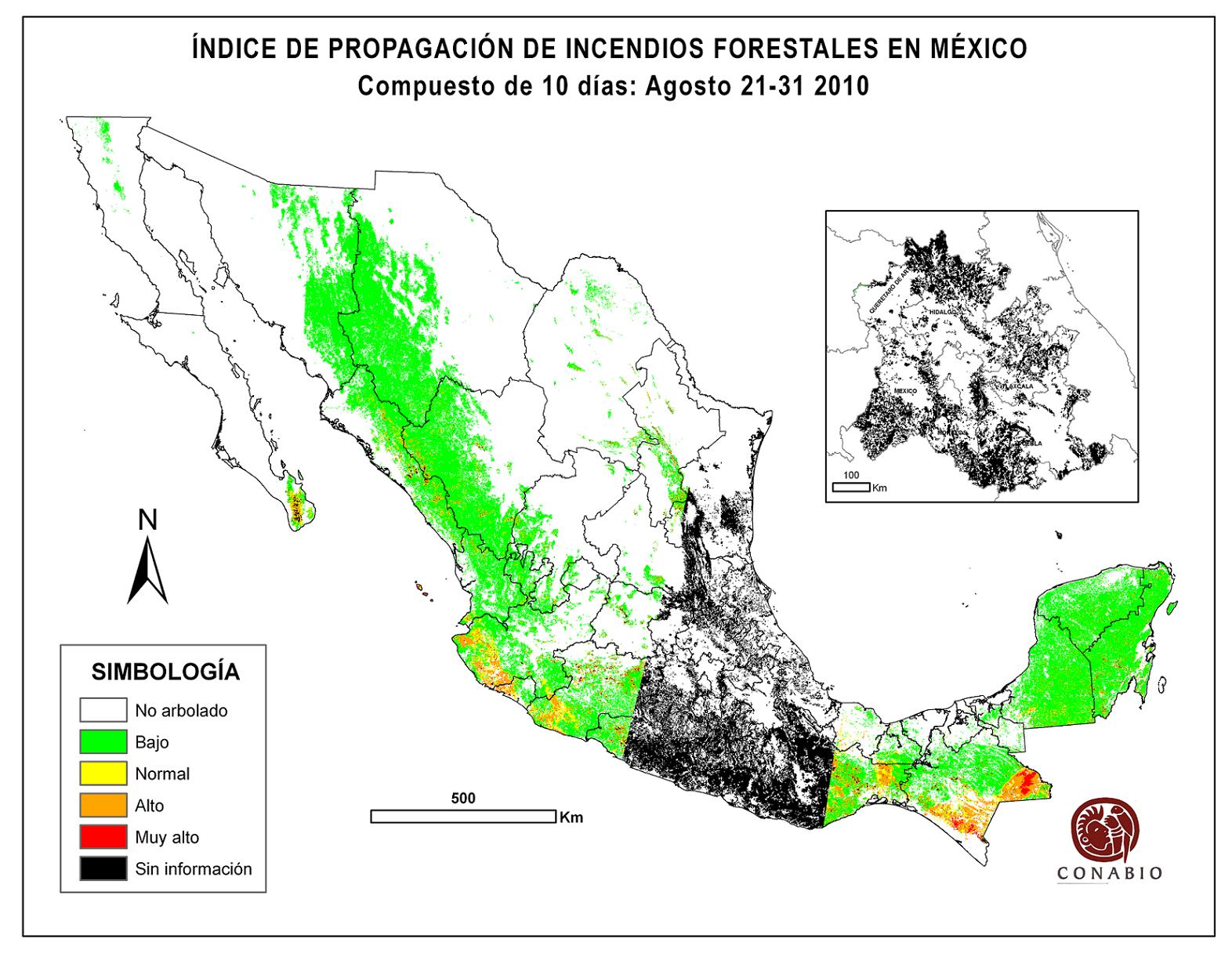 Indica el riesgo de propagación de incendios forestales. Se basa exclusivamente en el vigor de la vegetación, cuanto más seca está la vegetación, más rápido se podrá extender el posible fuego (incendio). Los valores para el índice son: Bajo -> Normal -> Alto -> Muy alto NA (No aplica) se refiere al agua, vegetación no arbolada y los usos de suelo mostrados en gris. ND (No disponible) indica que no hubo información para generar el índice. |
